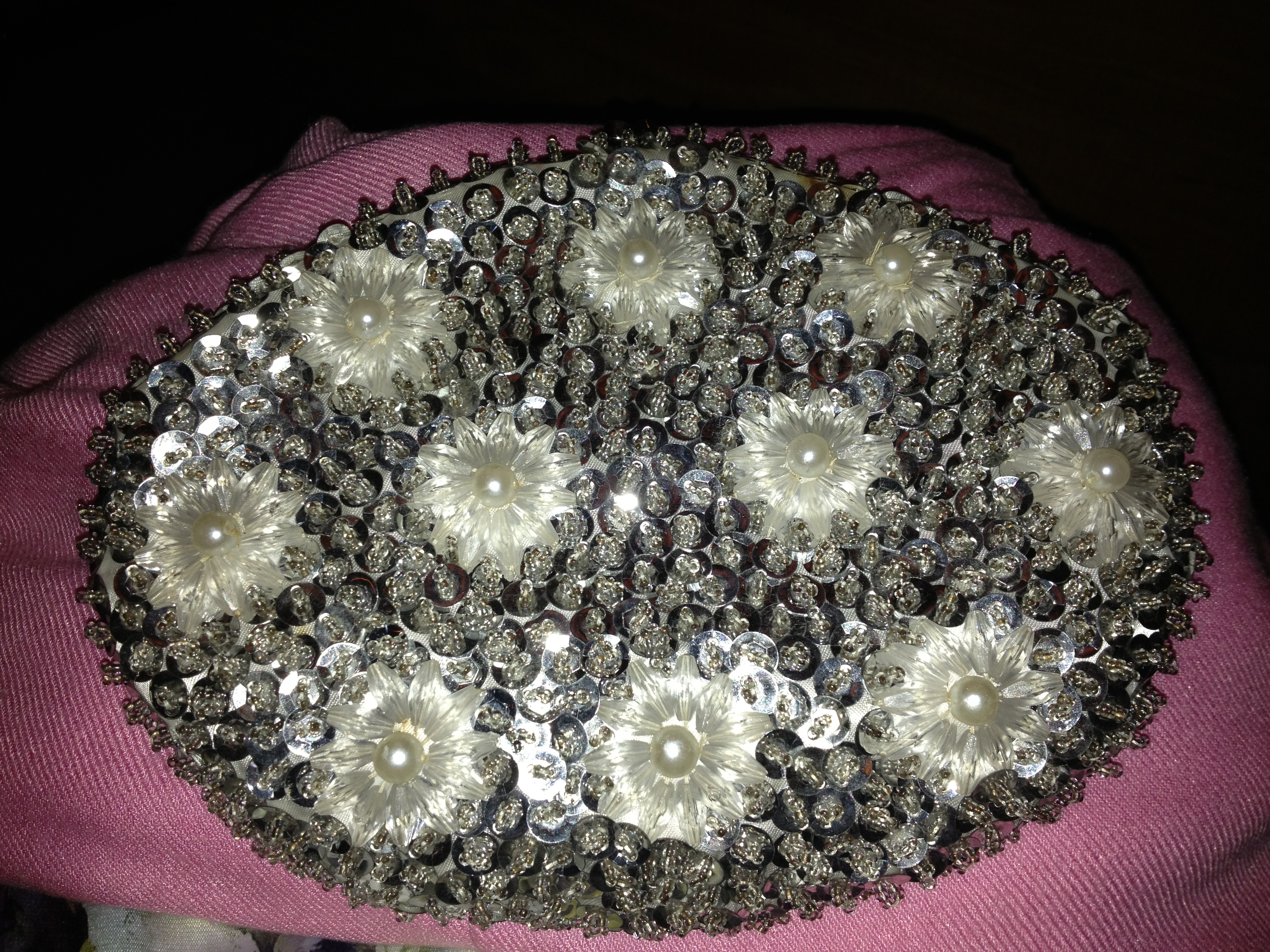 My night got off to an even better start when a lady dressed in pink complimented my 50’s style outfit (a good buy from Jo Borkett) that went well with my granny’s vintage pearl studded purse, circa 1959.