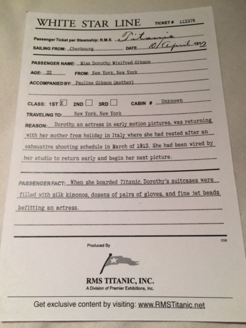 Upon arrival, one is given a “boarding pass” with the name of an actual passenger who was on Titanic. My name for the day was Miss Dorothy Winifred Gibson, and I am a 22 year old from New York, accompanied by my mother, Pauline Gibson. I am a first class passenger and an actress, travelling back to New York from Italy, after an exhausting shooting schedule (or so my card says.)