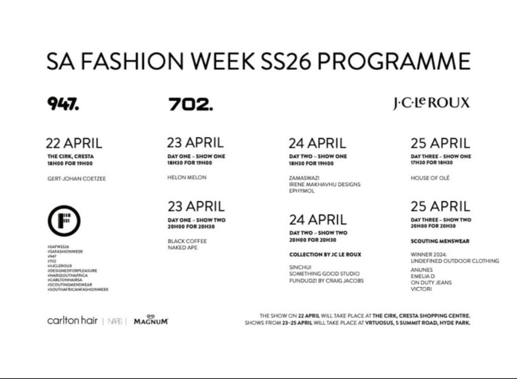 “South African Fashion Week has long been the cornerstone of a designer-led local fashion industry. We’re excited to amplify the stories and work of the country’s style trailblazers and to play a meaningful role across our Primedia platforms in inspiring and supporting a new generation of creatives – designers who are shaping culture, driving innovation, creating jobs, and contributing to South Africa’s GDP,” said Kelvin Storie, Chief Commercial Officer at Primedia.